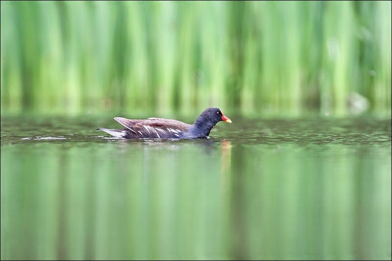 | A day that promised lots of sunshine, took up inland along the Tyne this weekend. Between Newburn and Wylam is an area I will visit between May and August because of the Sand Martins that nest along some of the banks. There are also a number of ponds dotted around the area, of which one of them I stopped off at. What caught my eye was the colour and pattern the reeds were creating at the back of parts of this particular pond – a nice backdrop for a picture of a bird I thought. Only trouble was, it wasn’t exactly a hive of activity and there was only two sections that stood out and had a clear view of, so I decided to get my camera out at a low view point and wait. The only obvious birds around were a nesting pair of Swans, two pairs of Moorhens and a Mallard family. At first, apart from the Swan, the others were wary of my presence and stayed at the far back in the reeds. After about half an hour, they started to swim around, cautiously at first, but eventually ignoring me. The only trouble was none were going past either of the two ‘ideal’ locations. It was an hour before the Moorhens started to go past the furthest of these spots though moving quickly making it difficult to get a good picture, especially due to the very low angle (I was lying down flat) and it was hard to see through the view finder correctly, keep a straight horizon and focus accurately. |